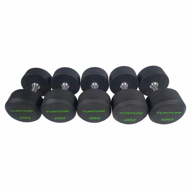â Professionelt PU-håndvægtsæt til tung styrketræningâ Ãnstøbt konstruktion for maksimal holdbarhedâ 5 par vægte fra 34 til 42 kg - perfekt til progression